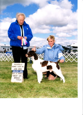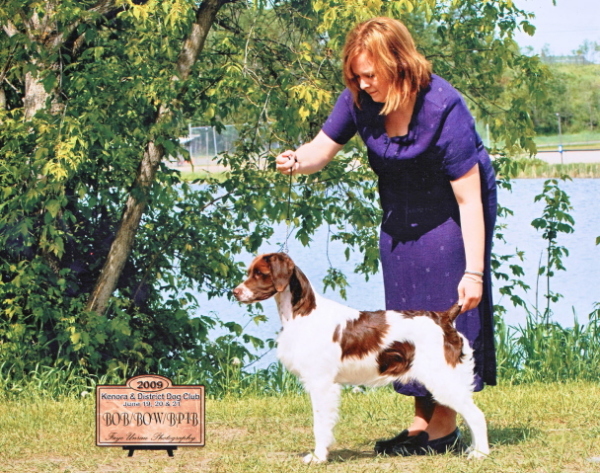 Briar is a Liver & White male weighing 40lb who comes from very strong field and conformation lines from the USA. He was bred by Copley Brittanys who are known for their outstanding dogs which consistently are among the top dogs in the USA in Conformation and are also field trained as well. His father is Dual Champion Almaden's River of Shadows who is one of the few Dual Champion Liver dogs in the USA and his mother is a Multiple Best In Breed Winning Champion female named CH Copley's Millennium Martini. Briar received his Canadian Conformation Championship (CAN CH) title as a 9 month old puppy after 4 weekends of showing with several Best of Breed Wins. At the 2009 Brittany Spaniel National Specialty Briar was awarded Best Puppy at the Nationals and also Winners Male. He then went back to the USA in the summer of 2010 to compete towards his American Championship (AM. CH). He finished his title with 4 majors, including a Best of Breed win out of the classes over some very nice Specials dogs.He is very flashy in the show ring and has beautiful movement and personality which the judges love. Briar has a very gentle nature and loves other dogs and children. He is very affectionate and loves to give hugs. He is a very obedience dog and easy to have around as he is not a hyper Brittany. Briar is also demonstrating good birding drives and loves to retrieve. With his beautiful conformation and wonderful personality his puppies will make great family pets, agility dogs, show prospects, and hunting dogs